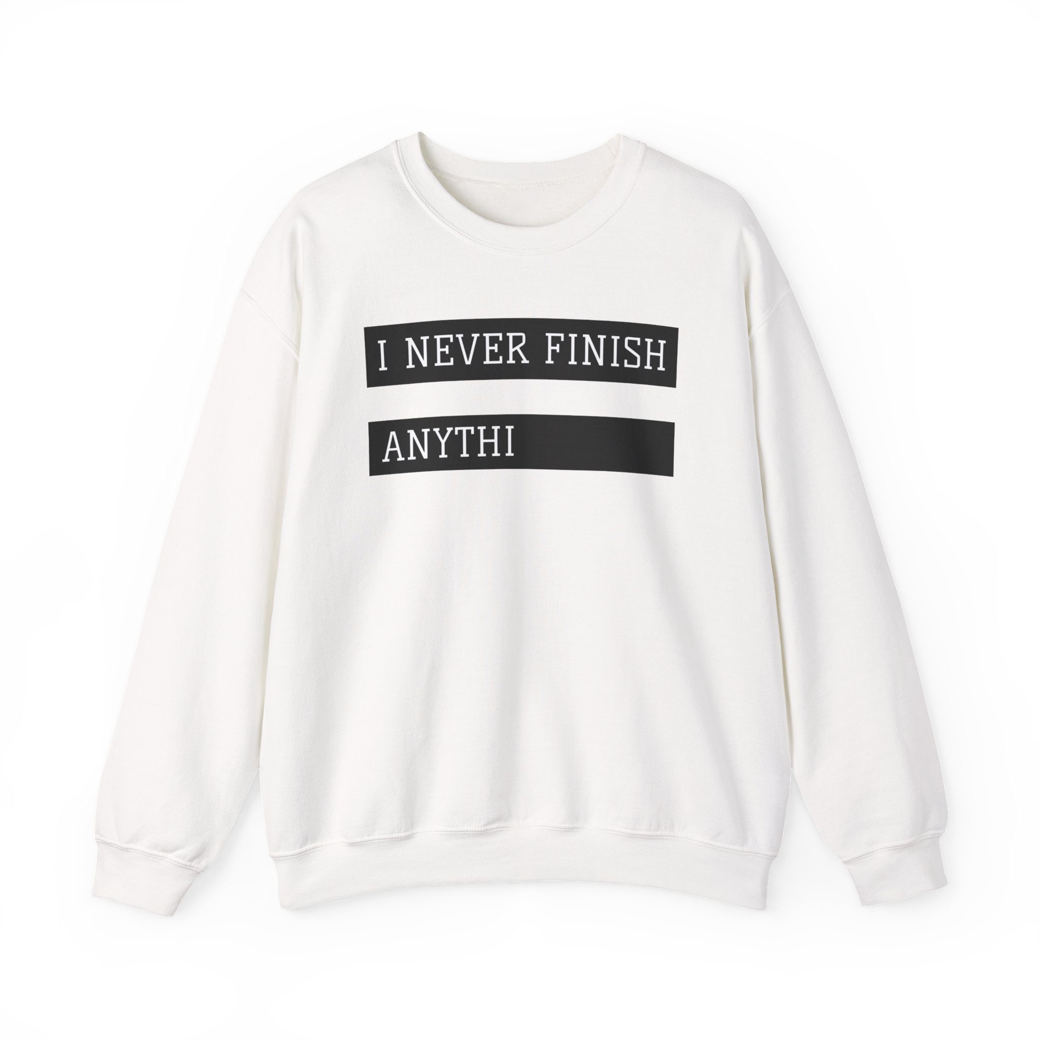 I Never Finish Anythi Sweatshirt — Funny Incomplete Text Crewneck Sweatshirt